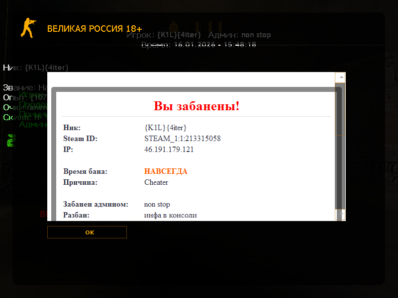 забанил нон стоп вчера сканирование прошел все нормально было щас зашел сказал что забыл забанить меня